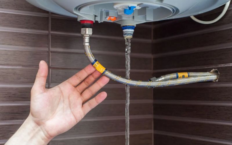 Khi quan sát phần mặt trước của bình nóng lạnh, đặc biệt tại khu vực lắp đặt thanh đốt, bạn sẽ thấy nước rò rỉ ra ngoài.